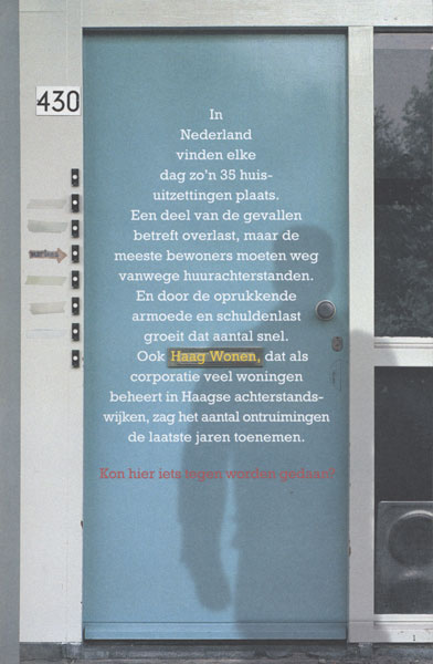Voor Haag Wonen, een grote woningcorporatie in Den Haag, maakte Robert Slagt met Koen Geurts onder meer HUIS IN/UIT, een reportage in boekvorm over hoe uitzettingsbeleid bij woningcorporaties in de praktijk uitpakt.
